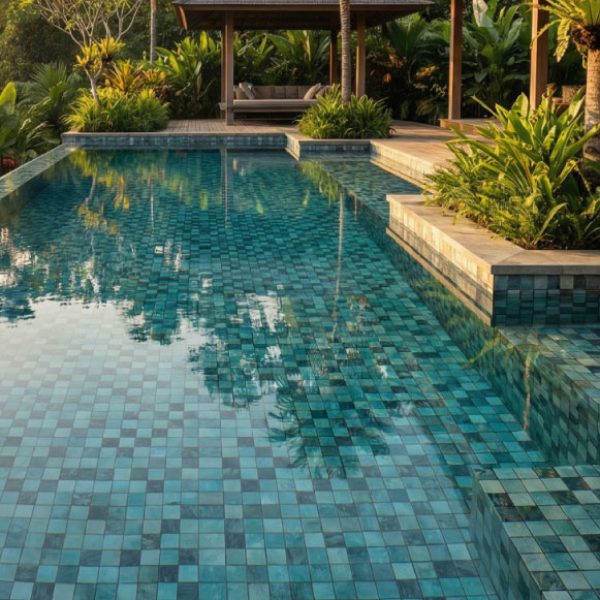 Tonalidades que transforman tu piscina en un verdadero oasis, producidas con la técnica artesanal del vidrio smalti.